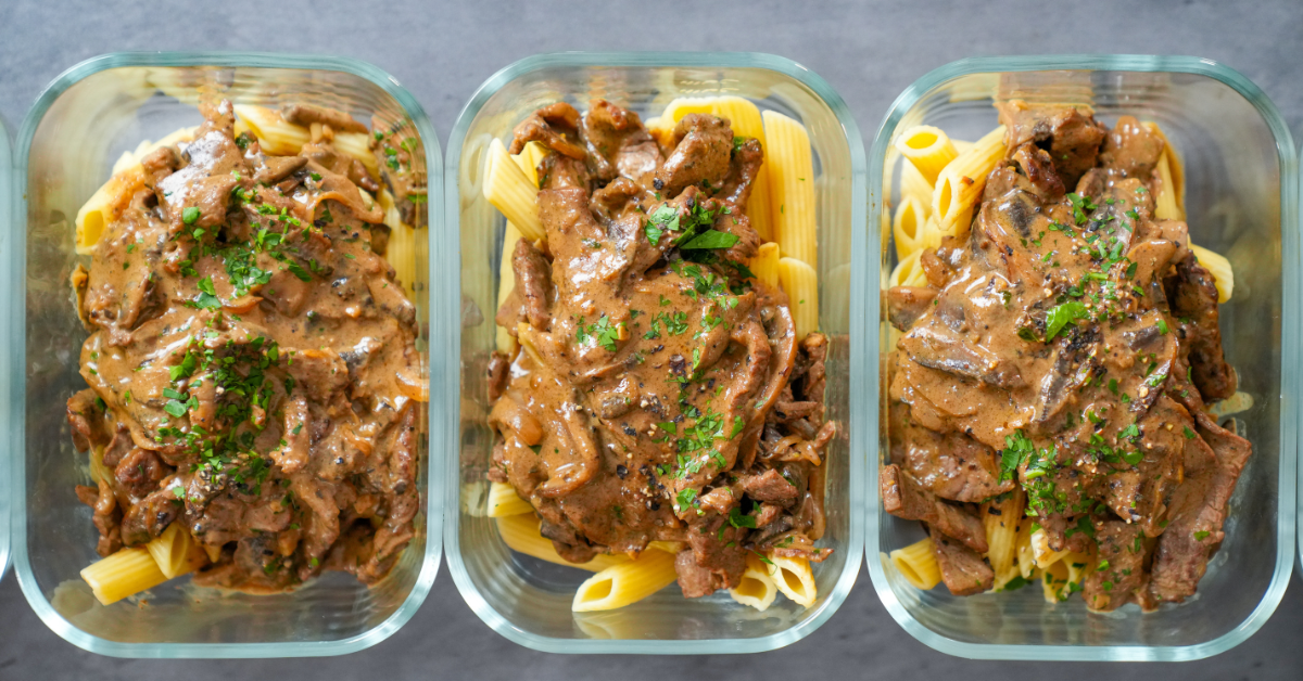 - Divide the noodles evenly into five containers. Top each with a generous portion of beef stroganoff and sauce. Garnish with extra parsley and cracked black pepper.